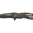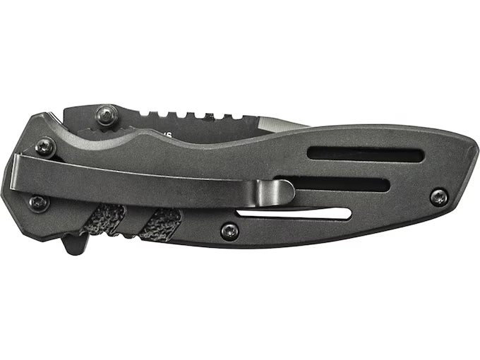 The Smith & Wesson Extreme Ops Liner Lock Folding Knife is made with a black, high carbon stainless steel, partially serrated clip point blade. This knife has ambidextrous thumb studs, jimping, and an index flipper. The black aluminum handle comes with jimping and a pocket clip.