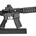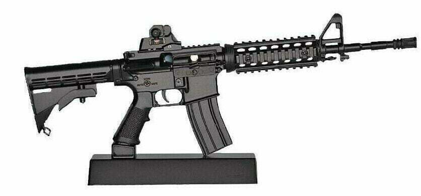 This Miniature AR-15 Toy Model is a 1:3 scale die-cast model. Made in metal, it captures all the detail and feel of an AR-15, and many of the parts function! Features adjustable stock positions, an adjustable sight, the charging handle pulls back, the ejection port opens and closes, the metal mag has a release feature, moveable trigger, and select-fire switch.