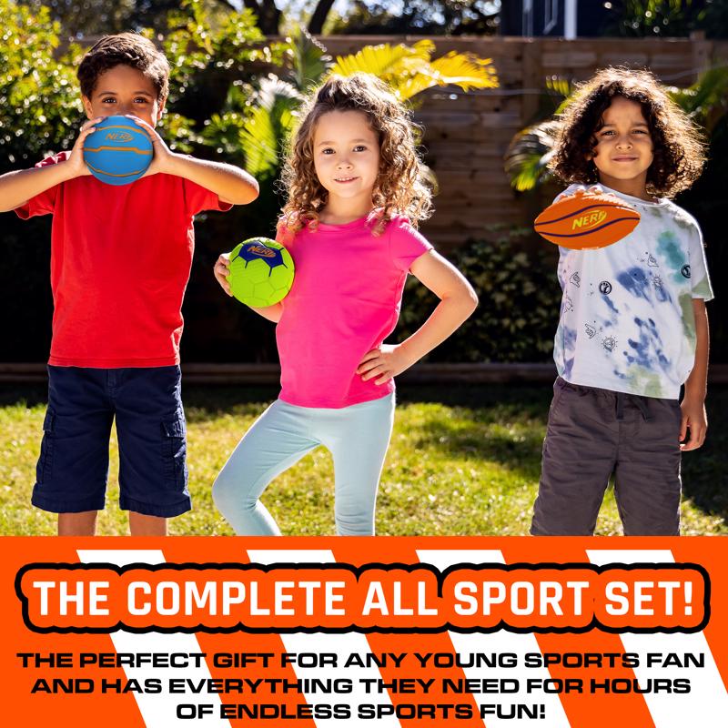 The NERF Kids Mini Foam Sports Ball Set is the perfect gift for any young sports fan. This mini foam sports ball set comes complete with (1) NERF soft foam football, (1) NERF soft foam soccer ball, and (1) NERF soft foam basketball for hours of endless sports fun. The soft NERF foam construction makes it safe and easy for kids to play indoors or outdoors so the game doesn't have to stop a count of rain. Designed for kids, these mini sports balls are the perfect size for kids to be able to grip, throw, catch and kick with ease. Help kids develop their soccer, football, and basketball skills all while having a ton of fun in the process. This all-in-one mini sports pack gives kids everything they need to play all of their favorite sports games. Grab your NERF Mini Foam Sports Ball Set and bring all the action to your home today.