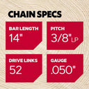 This 14" guide bar and chain combination features a 3/8" low profile chain that is ideal for homeowners and occasional users who want a low-vibration, low-kickback saw chain. The Chamfer Chisel cutters offer outstanding performance and are durable, easy to maintain and forgiving.