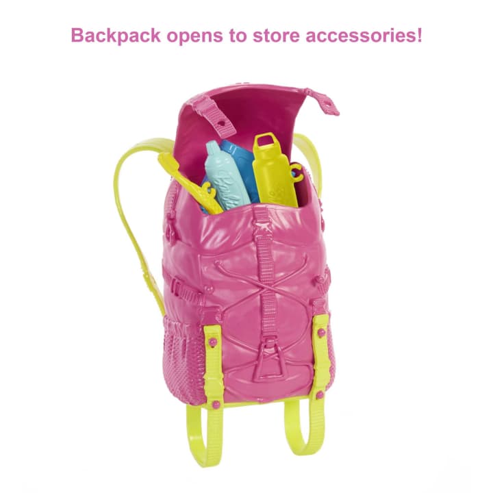 • Take the camping story from day to night with a backpack that opens and closes to store hiking essentials and a colorful sleeping bag that keeps Barbie® doll and puppy cozy at night.