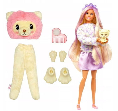 Barbie® Cutie Reveal™ Cozy Cute Tees™ dolls offer the cutest unboxing experience with 10 surprises! Discover a bashful Lion wearing a sewn-on t-shirt with the word 'Hope.' Remove the plush costume to reveal a posable Barbie® doll with long, colorful hair. Get cozier with more surprises to open like a headband, satin skirt and matching mini pet. Reverse the plush top for a fleece jacket and flip the costume head for a pet bed. Icy cold water adds even more cuteness with color-change transformations on the doll's hair and mini pet -- warm water changes them back for repeat fun! Kids will love discovering all the cute surprises in this cozy cute Barbie® Cutie Reveal™ series. Includes doll in animal costume and 10 surprises. Each doll sold separately, subject to availability. Dolls cannot stand alone. Colors and decorations may vary.