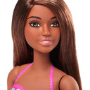 - In bright swimwear with a flowery graphic, Barbie® doll is ready for fun in the sun.