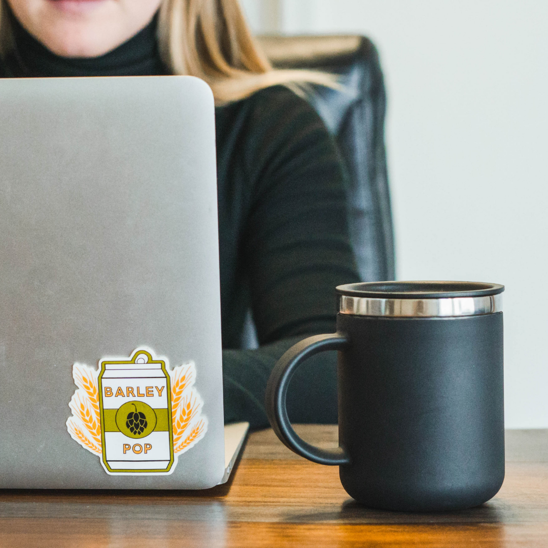 Toast to the adventurous at heart with this classic "barley pop" sticker! The yellow and olive can that features a hop label is surrounded by yellow barley in this playful image. 3"-by-3"