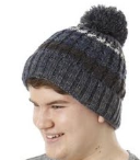 A cuffed beanie in 100% mixed-colored acrylic. Subtle stripes add a nice detail to this stretchy design and the fleece-band lining offers additional comfort and warmth. This style is topped with a generous thin-yarn pom.