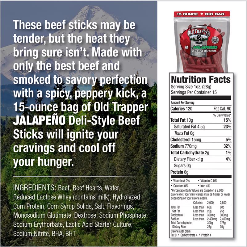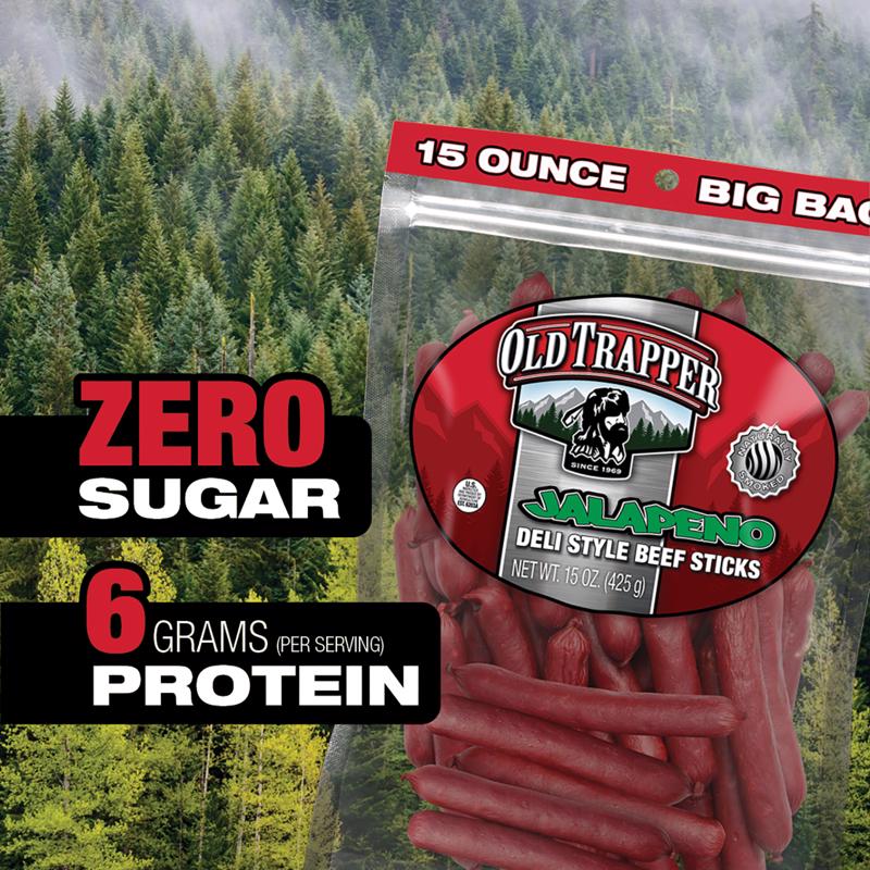 Old Trapper's jalapeno deli-style beef sticks will knock out your craving for bold and tasty beef and at 15 oz. to a pack, your hunger doesn't stand a chance.