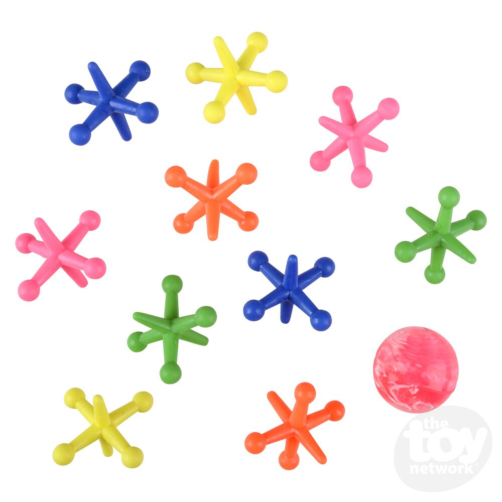 Our Big Neon Jacks Set includes 10 Jacks and one bouncy ball great for playing with others. Each piece is in a net bag with a header card.