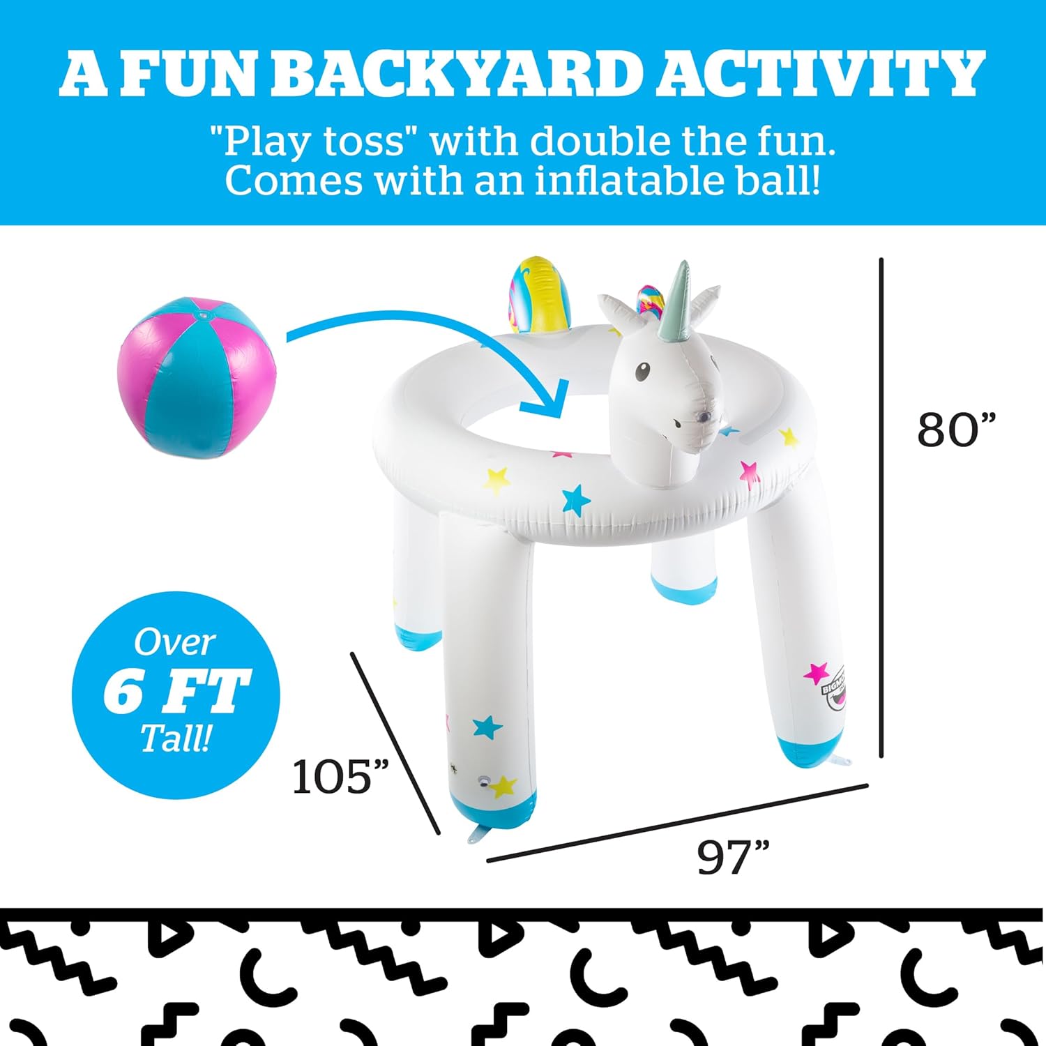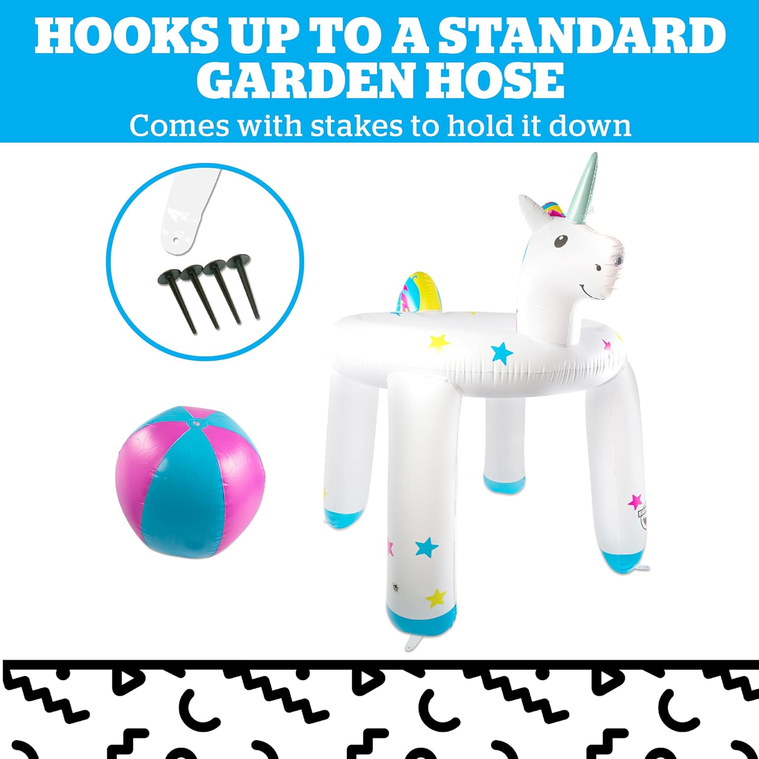 - THE LIFE OF THE PARTY: Stretch out summer parties with this giant unicorn sprinkler. Includes a matching ball to throw through the center ring for more fun & games.