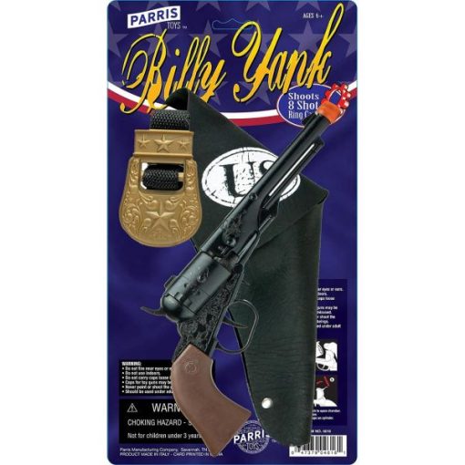 The Billy Yank Toy Pistol set fires fun 8 shot action ring caps. Features United States decorated holster. Designed after the original pistols of the Wild West era. Each gun is constructed with solid die-cast metal that looks like real antique metal and quality plastic that looks like real wood.
