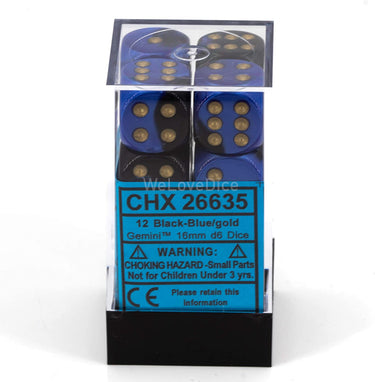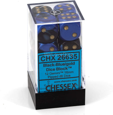 Chessex Dice D6 Sets: Gemini Black & Blue with Gold - 16Mm Six Sided Die (12) Block of Dice, Multicolor