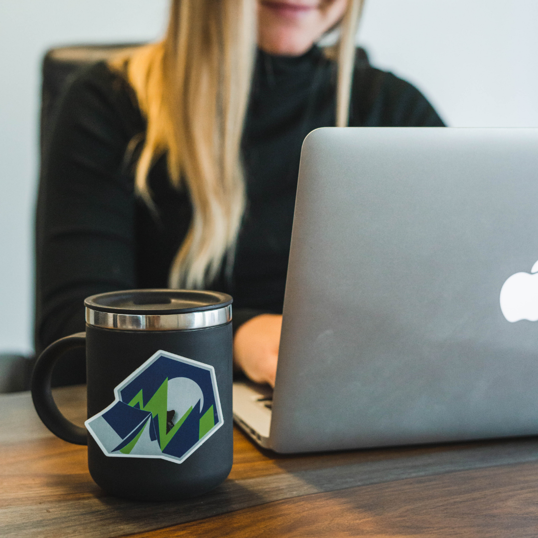 Display your passion for the great outdoors with this stylized campsite sticker. Sharp, graphic shapes in high contrast shades of navy blue, grey, and bright green come together to create a familiar camping scene. Can you spot Sasquatch? 3"-by-2.5"
