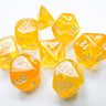 This set contains 8 Borealis Canary dice with white numbers with the following shapes
