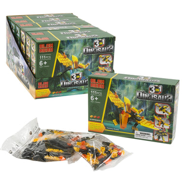 Description: Children can build their own dinosaur toy and convert it to two different objects with this building block set. It's ideal for ages six years and older as it does contain 111 pieces and instructions. These are a great buy for your toy section.Create three different objects111 pieces per kitInstructions included
