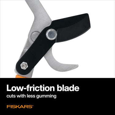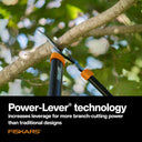 Fiskars Power Lever Lopper, 28 in. features compound lever technology that gives you more cutting power than traditional designs. Power through branches up to 1 3/4 in. thick with a fully hardened, precision ground steel blade and a low friction blade coating that resists rust and makes every cut even easier. All steel construction offers lasting toughness, and non-slip grips provide control.