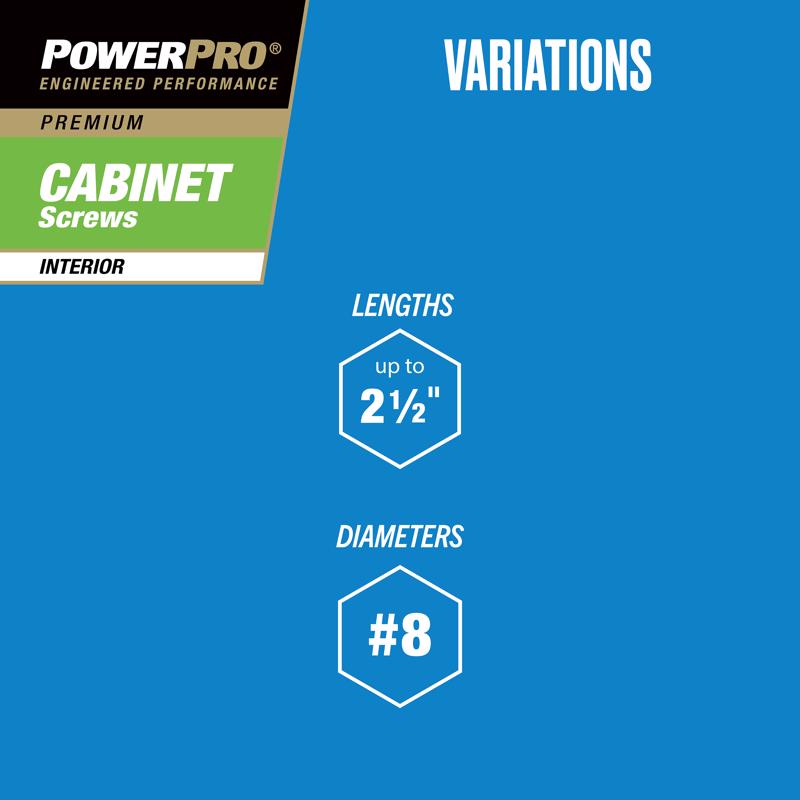 Power Pro Premium Interior Cabinet Screws are designed for wood construction and cabinet installation projects. Whether mounting cabinets-to-walls, joining face frames and more, the dome head design spreads the load evenly while preventing the screw from pulling through the materials. The cut point tip enables the wood screw to start fast without pre-drilling. The aggressive thread design makes it easier to pull the materials together for an exacting fit and the reinforced shoulder and neck provides added strength. Star drive helps prevent cam-out.