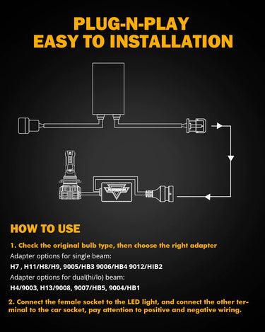 • Note: 9005/9006/9012/H7 sockets distinguish between positive and negative poles, please check the "+" & "-" before installing.