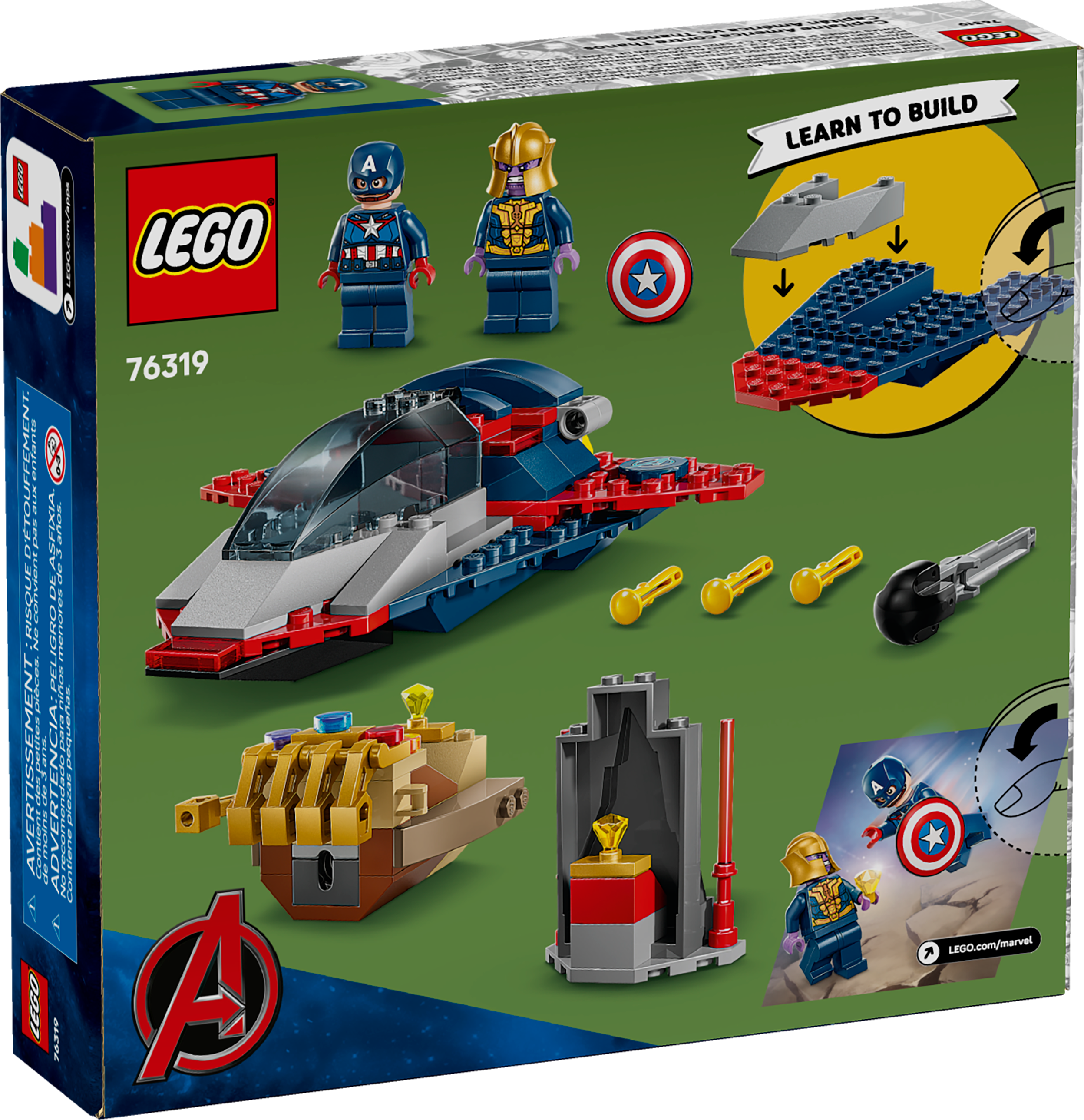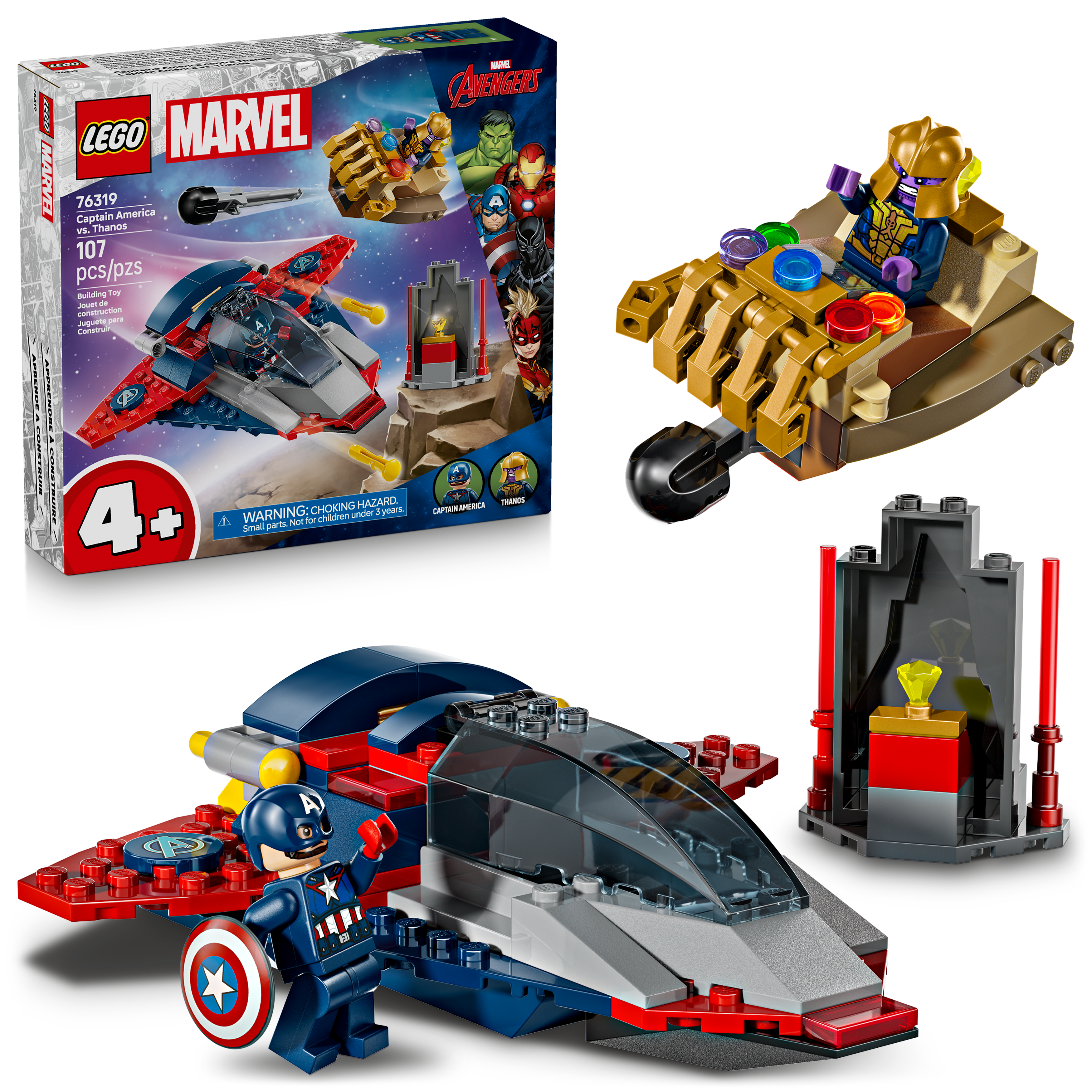 Captain America vs. Thanos (76319) is a buildable Super Hero toy for kids aged 4 and up. This high-quality construction toy for boys and girls features spaceships and LEGO® ǀ Marvel minifigures and is a great gift idea for any occasion. The build-and-play toy includes 2 minifigures: Thanos in a spaceship designed to look like his Infinity Gauntlet, with moving ‘fingers’ and a missile launcher; and Captain America, in a super-sleek Quinjet with 2 shooters, an opening cockpit and a hidden compartment for his shield. A separate build features a cosmic stone to inspire imaginative play as Captain America attempts to stop Thanos stealing the precious gem. Inside the box, each bag contains bricks and a large Starter Brick for a fast-to-build model and character so play can start quickly. Intuitive instructions are provided in the form of a colorful booklet. Contains 107 pieces. LEGO® sets for ages 4 and up are the perfect way for adults to share developmental fun with young children.