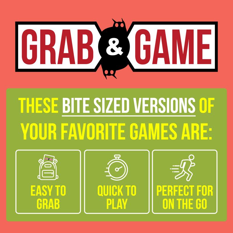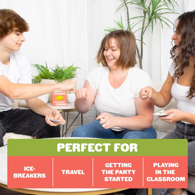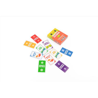 Take this fast-paced card game on the go to get everyone up and laughing in under two minutes. Happy Salmon - Grab and Game Edition is a quick travel game for 3-5 players. Each player gets a stack of cards. Every card has a simple action that requires a partner. Players frantically shout their actions, looking for matching players. When they find a match, they both complete the action and discard their used cards. The first player to finish the actions all of their cards wins.