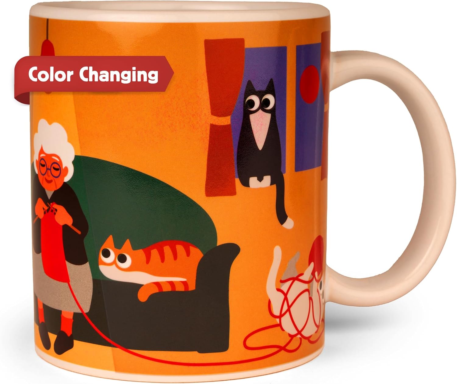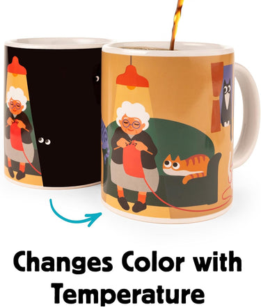 - Heat Reveals a Fun Design: Our morphing mug features thermographic ink that creates a fun color-changing effect depending on its temperature; when you pour your favorite hot drink into the cup, you’ll watch as the lights turn on around the little old lady to reveal her favorite cats before they disappear again as the mug cools