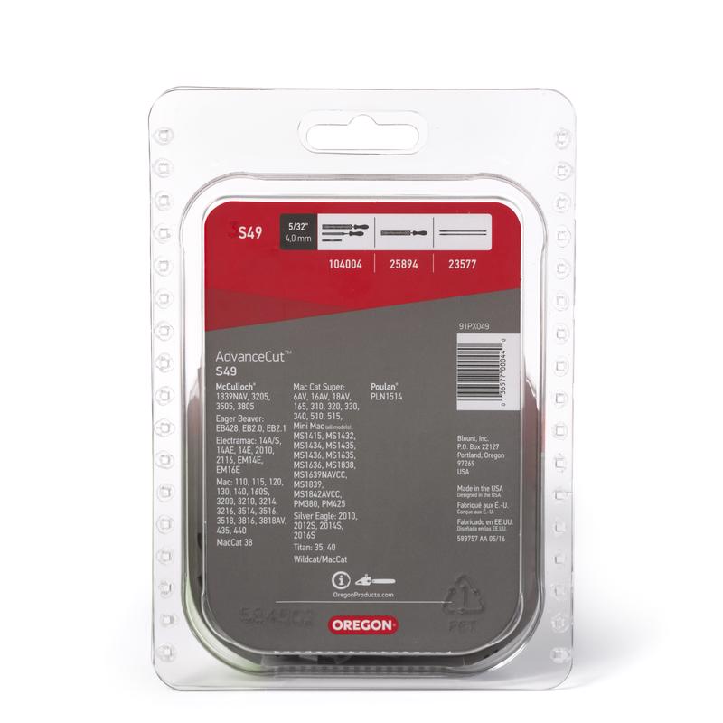 The Oregon S49 AdvanceCut™ chainsaw chain is a low-vibration and low-kickback chain for homeowners and occasional chainsaw users. This 14" chain features Chamfer Chisel cutters' with twin cutting corners that offer outstanding performance. These cutters are durable, easy to maintain and forgiving. This chain fits saws from Poulan®, McCulloch®, Remington®, Craftsman®, Mastercraft® and Wen.