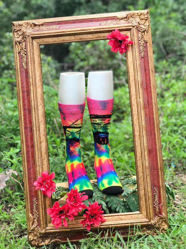 Our Cheech and Chong crew socks will have your competitors sock game Up In Smoke. These multicolor socks feature a radial tie-dye pattern with a black outline of Cheech and Chong on each sock. The thickened toe and heel offers maximum comfort and pain relief.