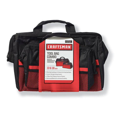 This CRAFTSMAN® 2-in-1 Combo set of Tool bags includes an 18-in bag for long tools and a 13-in zippered tool bag with pockets. Both bags are made of 600D Denier material, resisting moisture and wear and tear, and feature handles for easy carrying. The open-mouth structure on each bag enables quick and easy access to tools.