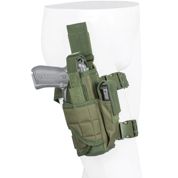 Our Commando Tactical Holster fits all large frame tactical pistols, pistols with flashlights, or large laser mounts. Two slip-proof adjustable QR leg straps, a Level II thumb break security system, and a hook and loop belt attachment system with a QR buckle are all included. It also comes with a clip pouch for rapid reloading.