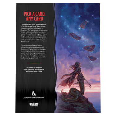 The Deck of Many Things is a famous Dungeons & Dragons magic item whose effects are as spectacular as they are unpredictable. Within this box, you'll find The Book of Many Things, which illuminates the deck's mysteries and provides everything Dungeon Masters need to use it in their campaigns. This book includes advice, adventure locations, and new monsters for Dungeon Masters, as well as character options, magic items, and organizations for players, all inspired by the deck.