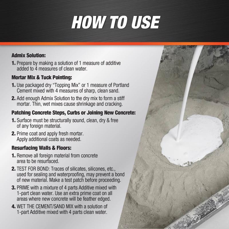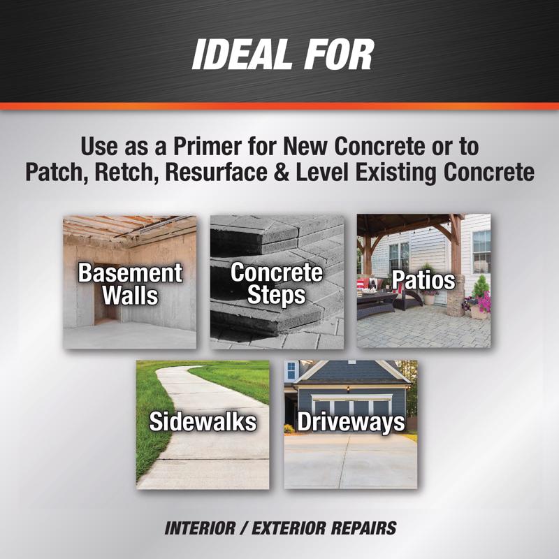 DAP Concrete Bonding Additive is an advance vinyl compound that can be used to create a high moisture resistant, high density concrete. DAP Concrete Bonding Additive is perfect for new to old concrete patching, resurfacing and leveling. It is excellent for capping walls, patching steps and tuck pointing.