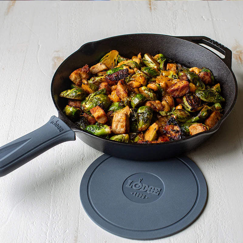 Cast iron gets hot, but this handle holder helps you transport and serve piping hot pans while protecting your hands up to 550˚F. The high-quality silicone provides a secure grip on hot cast iron so you can maneuver cookware with ease. The silicone handle holder is designed to fit snuggly on Lodge classic cast iron skillets, 9 inches and larger.