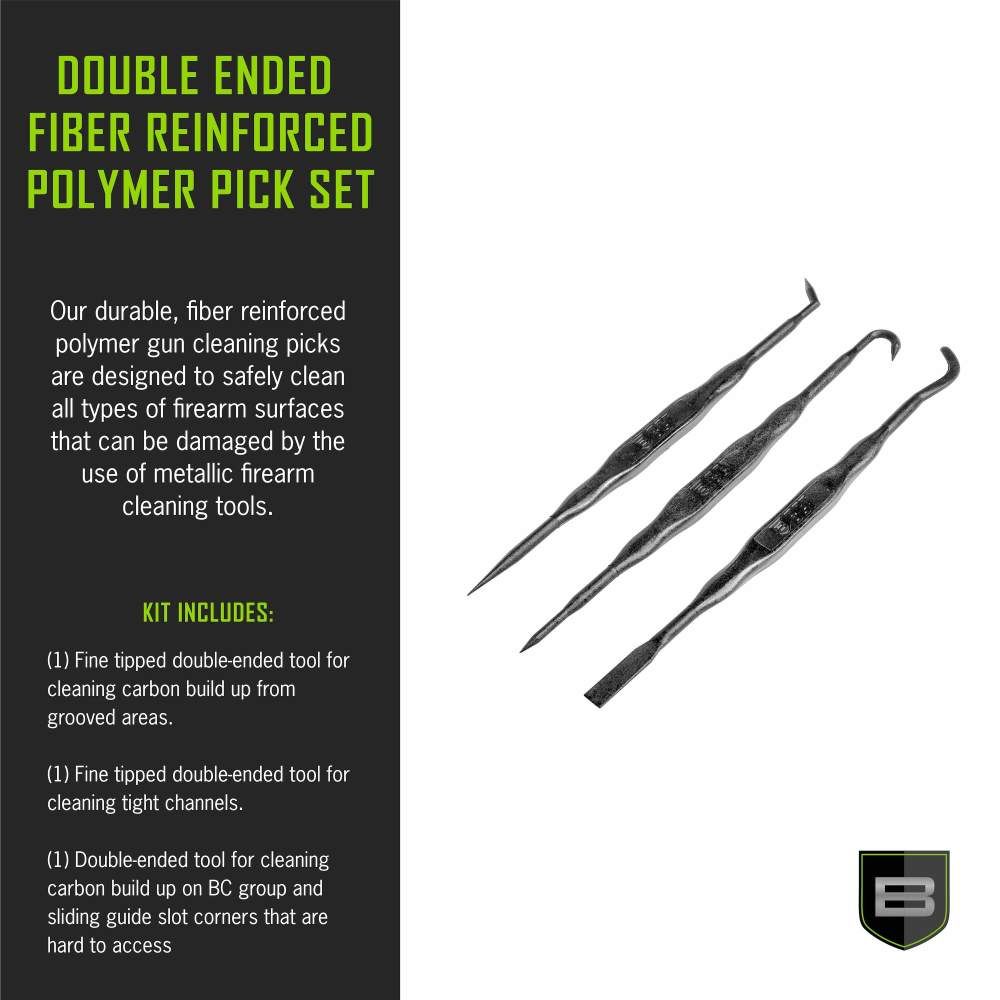 - GUN CLEANING PICK SET: Our durable fiber-reinforced polymer picks feature three designs to help safely clean all types of firearm surfaces. They won't scratch or damage metal surfaces, allowing you to apply enough pressure for a good clean.