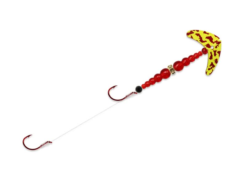 The Double Whammy Pro combines a Smile Blade, Wedding Ring and two sharp red hooks to create a spinner that will effectively shake crawlers or other baits for walleye, trout and kokanee.