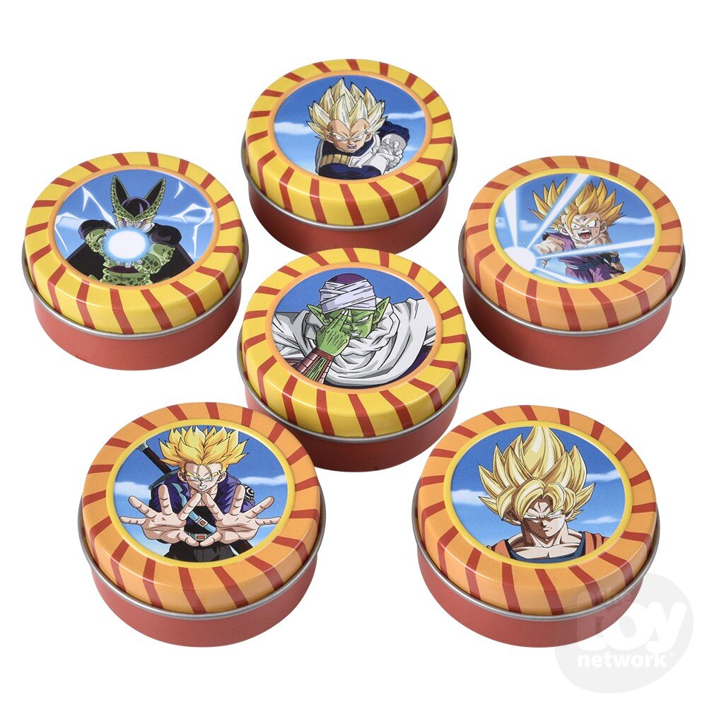These mystery candy tins featuring characters from Dragon Ball Z contain hard candy treats. 6 assorted tins to collect