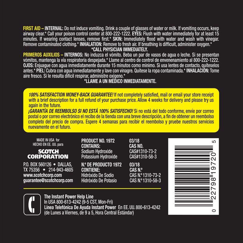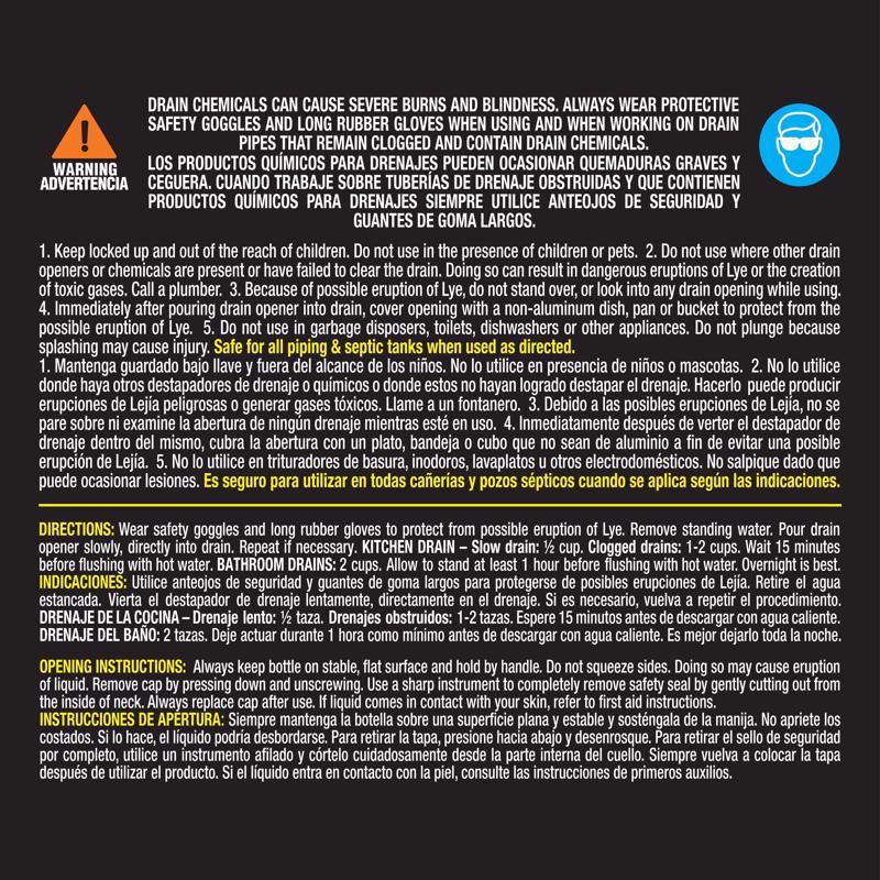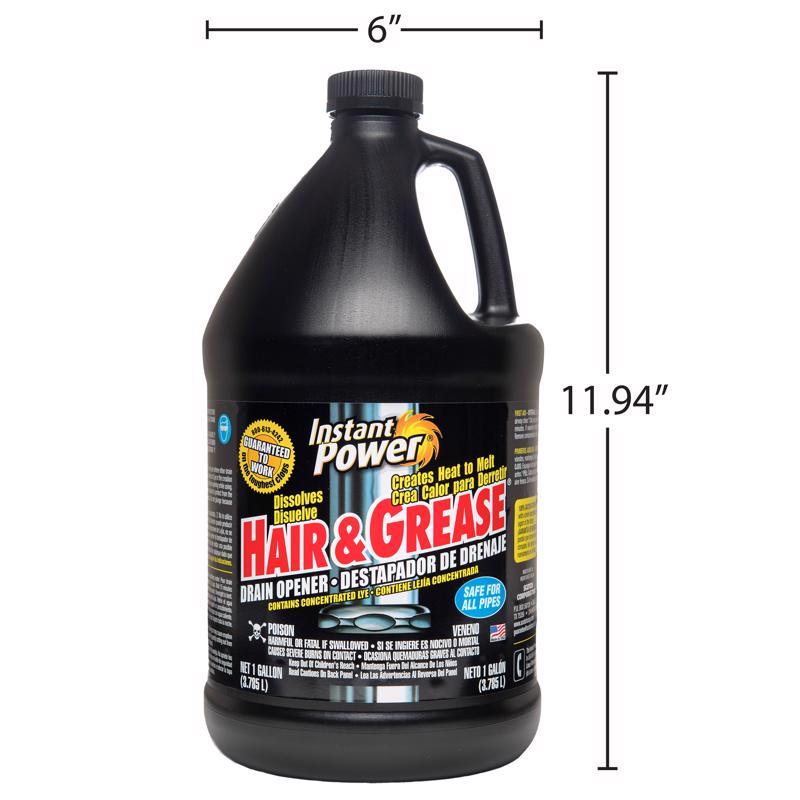 Instant Power Hair and Grease Drain Opener is the solution for the most common drain stoppages. This is the strongest non-acid formulation on the market. We recommend that Hair & Grease be allowed to stay in the drain overnight. The longer it remains in the drain the more drain clogging material it will dissolve. Chemical sodium hydroxide and potassium hydroxide. Up to 8 treatments per container. Safe for all pipes and septic systems.