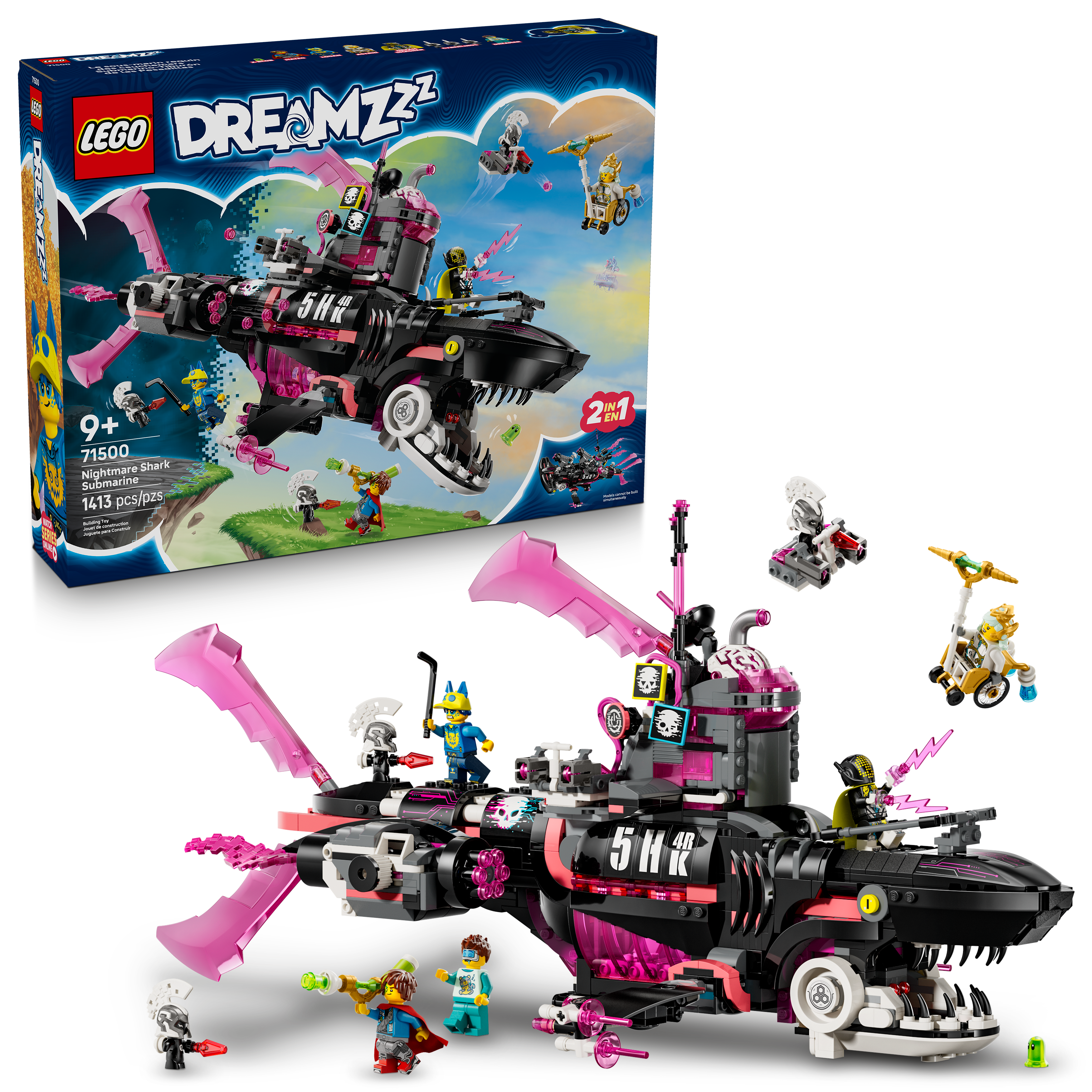 Kids dive into the dream world with this LEGO® DREAMZzz™ Nightmare Shark Submarine (71500) building set for boys and girls aged 9 plus. Swimming with cool details, this fantasy playset lets fans immerse themselves in an epic adventure alongside Mateo, Logan and Astrid. Young dreamers can build a shark model before transforming it into a shark submarine toy or a hammerhead shark battleship. Details include detachable mini flying aircrafts, stud shooters, missiles that fire out of the shark’s mouth, an opening cockpit and a prison inside the shark. It also includes modular shooters that are compatible with other sets in the LEGO DREAMZzz 2025 range (sold separately). Mateo, Logan, Astrid, Dreamsmasher and dreamer minifigures and Z-Blob and 3 Cyberling figures bring the action to life and fuel creative role play. A thrilling gift for kids, the playset includes story-led building instructions that encourage kids to immerse themselves in the adventure and become dream world heroes.
