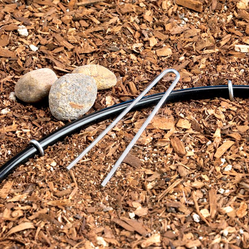 No need to wrestle with tubing or struggle to keep wayward emitters in place when you tack them down securely with the 1/4 in. Tubing Hold-Down Stake. Works like a giant staple to hold down supply tubing so they stay just where you want them, yet removes easily so you can expand or change your drip watering system as needed. Also known as a U Support Stake, the 3-1/2 in. metal stake is ideal for keeping supply tubing and emitters in place to water flower and vegetable gardens, trees, shrubs, and container plants. It can also be used to hold down chicken wire or tarp for other garden projects. Made of galvanized steel and withstands extreme climate conditions.