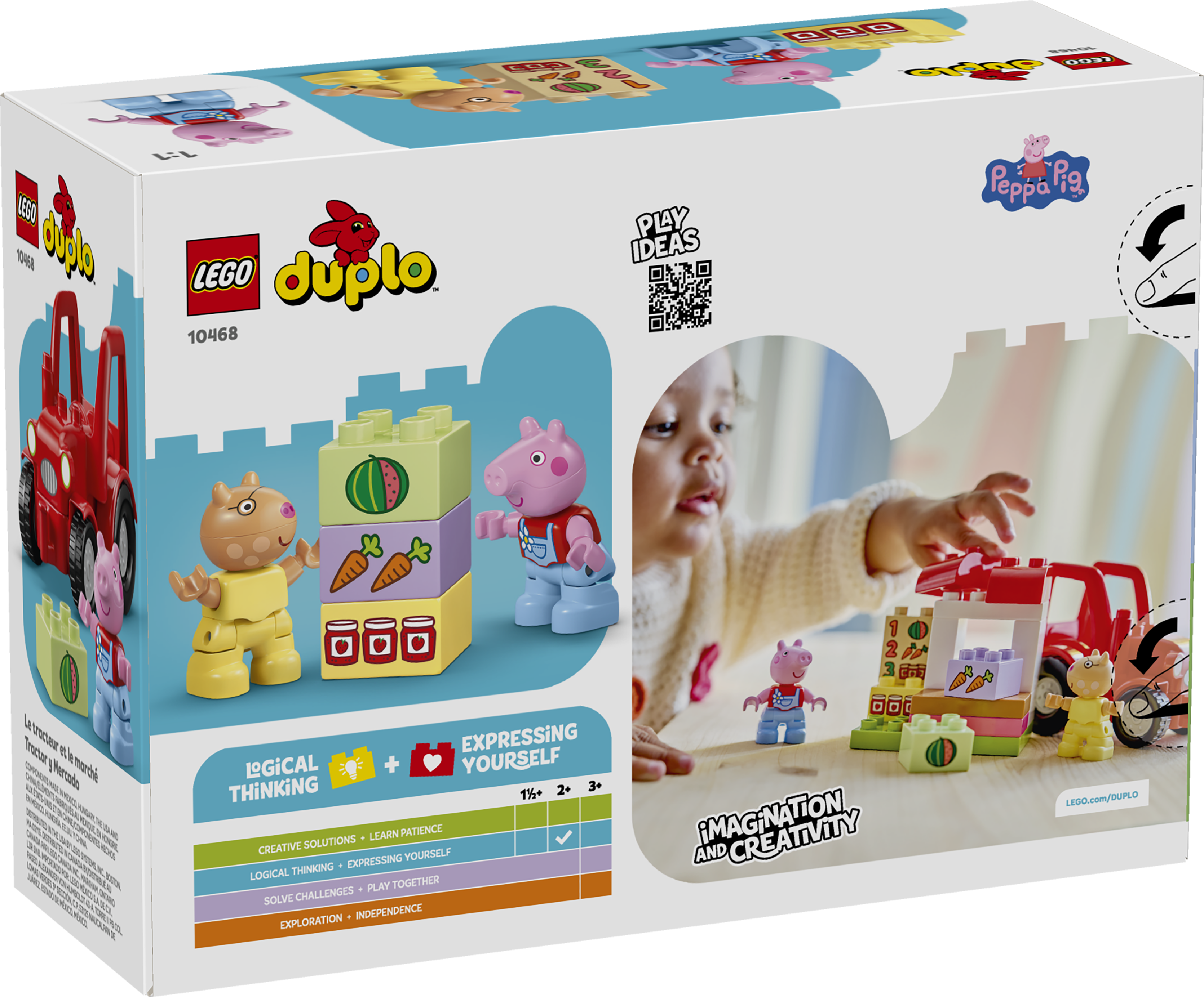- PEPPA PIG TOY – Toddlers ages 2 and up recreate scenes from their favorite show while they pretend to play at running a farm store with the LEGO® DUPLO® Peppa Pig Tractor and Market (10468) building toy