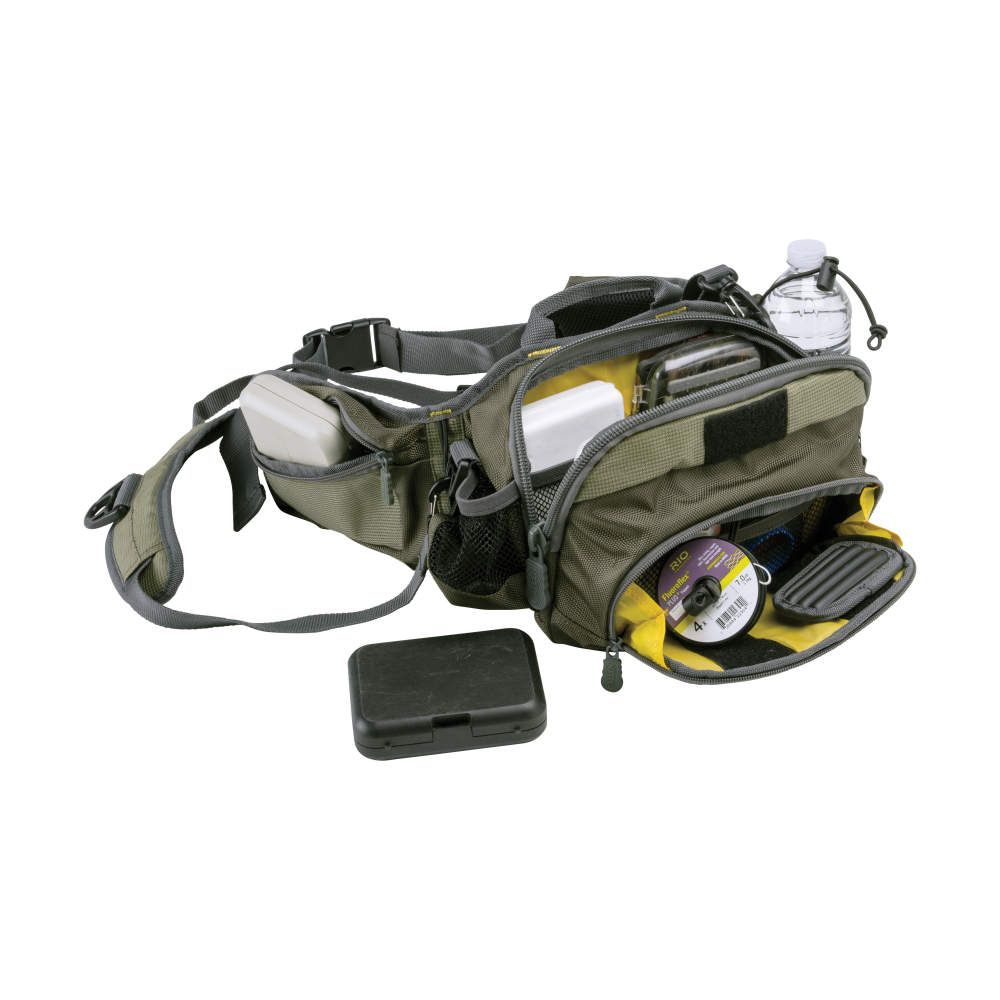 The Allen Company Eagle River Lumbar Fly Fishing Pack holds up to six fly boxes or two 9-inch tackle boxes. It features a wide mouth opening, allowing easy access to the main compartment, and has a zip-down workstation with tippet tender and fly patch. This pack provides a padded sling strap with a net D-ring, plus multiple exterior D-rings for all your accessories. The lumbar pack also has high visibility lining, multiple interior storage pockets, a padded cool mesh waist belt, two water bottle pockets, and dual side pockets for accessories or extra fly boxes.