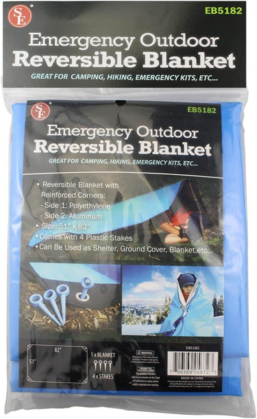 SE is proud to present our Emergency Outdoor Double-Sided Blanket with Plastic Stakes. Our blanket is a great addition to your gear for boating, camping, emergency and survival kits, fishing, hiking, hunting, etc.