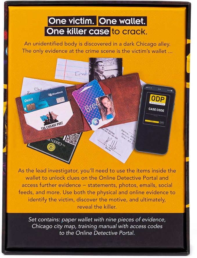 • INCLUDES: Paper wallet with nine pieces of evidence, Chicago city map, training manual with access codes to the Online Detective Portal, and instructions.