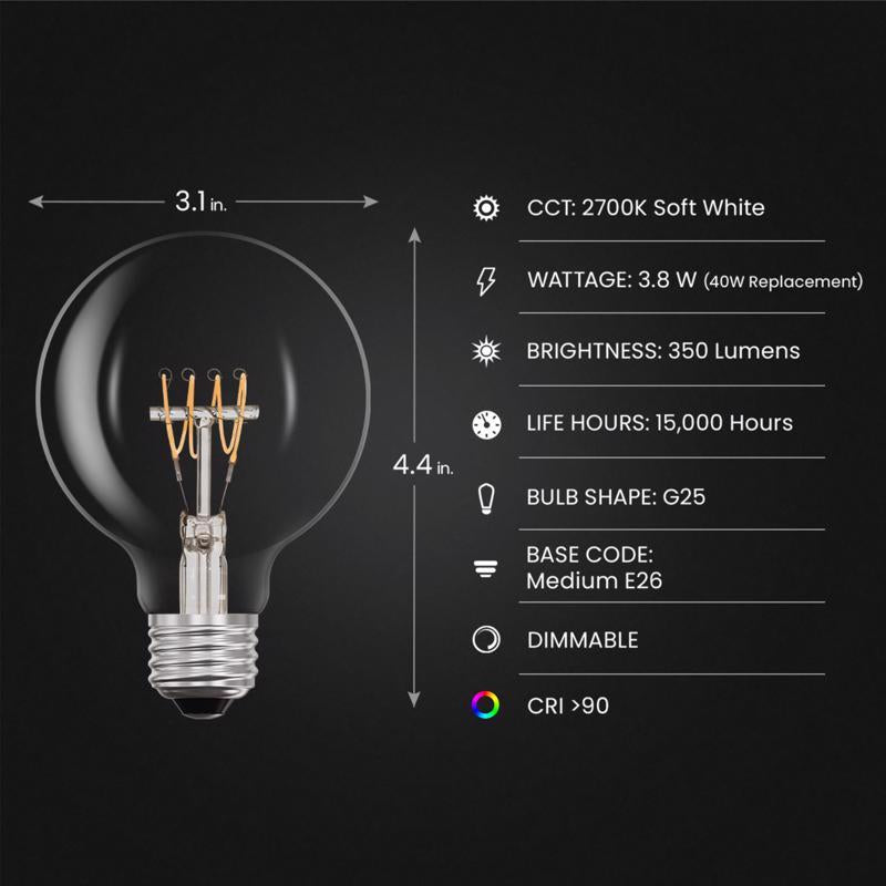 Enjoy both elegant design and energy-saving technology with decorative Exposed Thin Filament Globe Light Bulbs from Feit Electric. G2540/H/927CATFIL bulbs replace 40-watt incandescent bulbs, emitting 350 lumens while only using 3.8 watts of power. Their exposed thin filaments in clear glass blend in while standing out, providing a new twist on modern industrial style. They give off a 2700K Soft White glow is ideal for creating a relaxing and comfortable atmosphere with no harsh glare. These dimmable bulbs fit in any standard Medium E26 base. Instantly liven up the decor and feel of any room. With a 90+ CRI, these bulbs make colors appear more vivid and true-to-life. Save up to 90.5% more energy than standard bulbs and get up to 15,000 hours/13.7 years of use (based on 3 hours per day use). The estimated energy cost per bulb is only $0.46/year.
