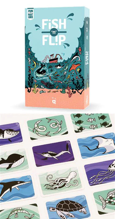 Unfortunately, the fishing nets that scour the ocean floor don't JUST catch fish - they also capture many species of marine mammals that don't belong on our plates! In Fish'n Flip, play together to free as many animals as possible before the end of the game. With play that will undoubtedly remind you of Tetris, Fish'n Flip is the perfect game to bring young and old together. Optimize the use of action cards to create cascading movements and free the animals - to achieve a clean sweep, you'll need to work together!