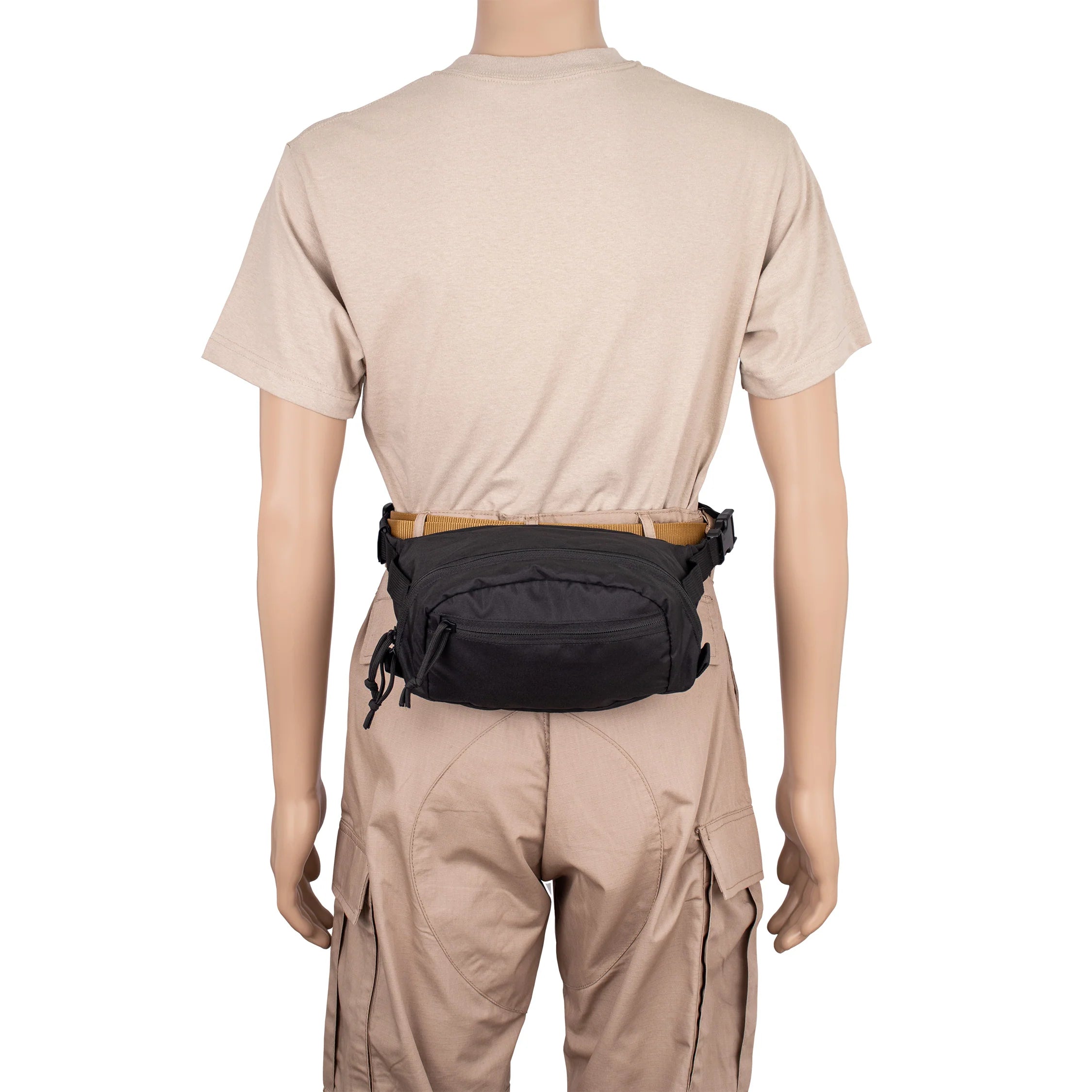 It has zippered multi-purpose pockets, a universal holster, and a reinforced divider. It can be worn as a belt pouch, fanny pack, or chest pack.