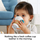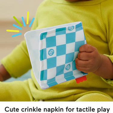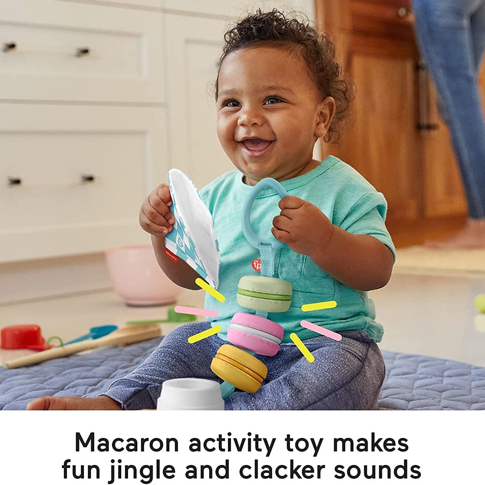 The Fisher-Price Bakery treats gift Set features three infant toys that make baby's playtime extra sweet, for here or to go! The Macaron activity toy makes fun jingle and clacker noises and attaches to a bag or stroller for take-along fun. This set also includes a crinkle napkin for catching imaginary crumbs and a coffee cup teether for baby to rattle and chew.