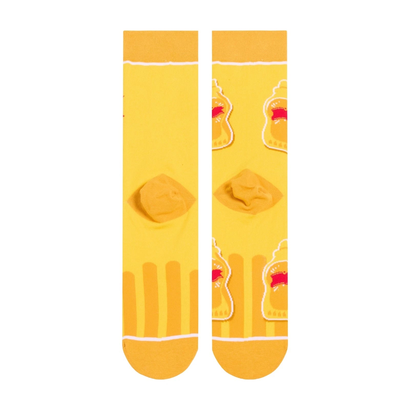 - Right sock features French’s Mustard logo; left sock is patterned with bottles