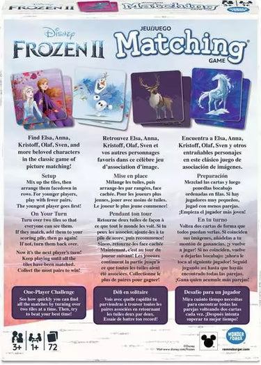 It's the classic game of picture matching, featuring your favorite Frozen 2 Disney characters. Flip over colorful tiles to find Elsa, Anna, Olaf and more. Collect the most pairs to win! 1-4 players, ages 3 and up.