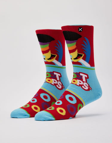 Add color and nostalgia to your outfit with these Froot Loops Mash-Up Men's Crew Socks! Featuring Toucan Sam and the iconic fruity cereal rings, these crew socks are as playful and vibrant as the breakfast that inspired them. With bold reds, blues, and multicolored loops, these crew socks offer a fun way to show off your love for the classic Kellogg's cereal. Perfect for fans of Froot Loops and anyone who likes to start their day on a bright and cheerful note. Follow your nose to style with these fun and comfortable crew socks!