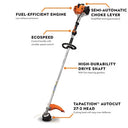 Dependable performance meets variable speed control. The STIHL FS 94 R trimmer delivers one of the best power-to-weight ratios in its class, weighing just over 10 pounds – great for maneuvering around hills, landscaping stones and other terrain. Its innovative control handle features an ECOSPEED throttle set wheel, allowing you to set the most effective throttle speed for a specific application such as low throttle around delicate plants. Combined with a high-powered, low-exhaust-emission engine and anti-vibration system, this grass and weed trimmer is a great everyday landscaping tool for trimming professionals.