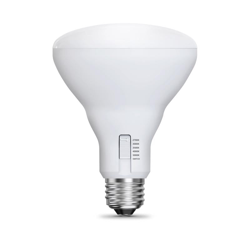 Enjoy all the benefits of advanced LED energy-saving technology with Feit Electric Adjustable White LED BR30 Light Bulbs. These dimmable 12.2W LED light bulbs produce a similar light output while using 85 percent less energy than a standard 85W incandescent bulb. Choose from Soft White, Bright White, Neutral White, Cool White, and Daylight color temperatures directly on the bulb or from a standard wall switch to get the perfect color temperature for any room and any mood. This high-performance bulb also has a high (CRI) of 90+ so colors appear more realistic and vibrant. Get instant on to full brightness with relatively cool running performance. These Feit Electric BR30 bulbs have an average life of 25,000 hours/22.8 years, are RoHS compliant, and are 100 percent mercury free. Choose a dependable energy-saving bulb for general-purpose, flood, or track lighting in residential or commercial applications. Suitable for damp locations.