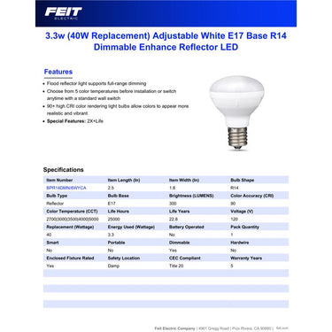 The Feit Electric Enhance LED product line features our highest quality energy-efficient light. This Adjustable White R14 dimmable reflector LED light bulb with an E17 intermediate base produces a similar light output but uses less energy than a standard 40W incandescent light bulb. Adjustable White color lets you preset your preferred color temperature using the toggle on the fixture or switch anytime from a wall switch. Match your current lighting or get the perfect light in every room for every mood. Set the mood further with smooth dimming on LED-compatible wall dimmers (sold separately). This high-performance bulb also has a high (CRI) of 90+ so colors appear more realistic and vibrant. Get instant on to full brightness with relatively cool running performance. It has an average life of 25,000 hours/22.8 years, is RoHS compliant, and is 100 percent mercury-free. Choose a dependable LED bulb for general-purpose residential or commercial applications. Suitable for enclosed fixtures and damp-rated for covered outdoor use.